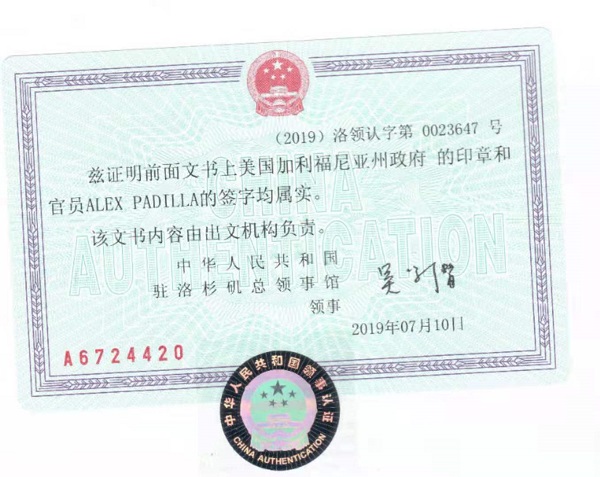 Certified by the Consulate General of the People's Republic of China in Los Angeles on July 10, 2019